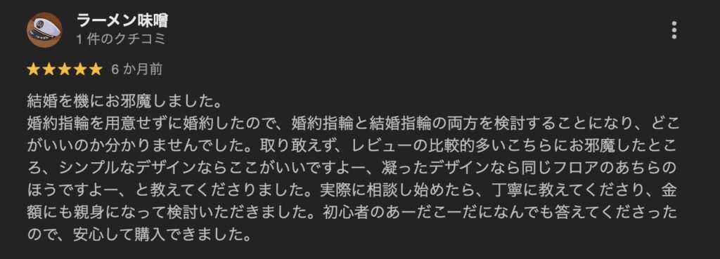 私自身も「元・指輪選び迷子」でした。 だからこそ、その期待と不安が入り混じった気持ちが痛いほど分かります。 そこでこの『手帖』では、あなたの不安を解消するため、青森店の口コミや評判を徹底的に調査しました。