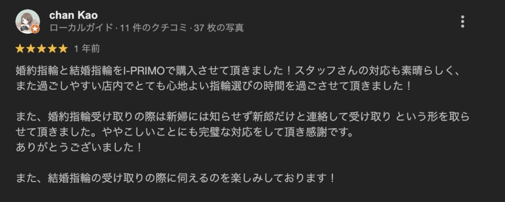 次に評価が高かったのが、「接客」です。 アイプリモの接客は、より「フレンドリー」で「親しみやすい」と評判です。ジュエリーショップ特有の緊張感が苦手な方でも、リラックスして相談できる雰囲気が、多くのカップルに支持されています。